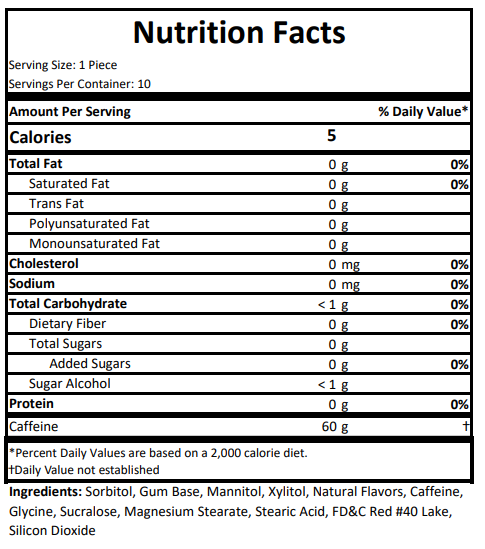 Other Ingredients: Sorbitol, Gum Base, Mannitol, Xylitol, Natural Flavors, Caffeine,